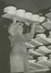 Damning med borste av rågodsbrända tallrikar som ska glaseras (Hald, 1991:126). Personer: okända