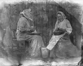 "Råskalning av potatis till pannkaka". Två kvinnor sitter och skalar potatis med hink mellan sig.