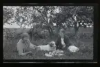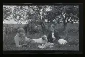 "Annie och Elsa Råstedt, Fogelstad" Två kvinnor och en hund har picnic i en trädgård.