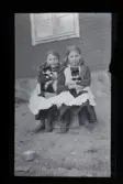 "Märta och Lisa Larsson, Lötstugan" Porträtt av två flickor som sitter med varsin katt i famnen.