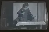 "Anna-Lisa med kaninvänner." Frida Anna ElisabethFredriksson sitter på ett bord med fyra kaniner.