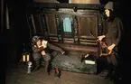 Enligt bildförteckningen är det julkalas i Utmossen, Fageråkra, och det kan vara julgröt som serveras. Men dahliorna i vasen på bordet antyder snarare att det är en måltid på sensommaren eller tidig höst. Väggen har en hög och blankt bemålad träpanel. Flickorna sitter på kökssoffan och på andra sidan bordet står en säng.