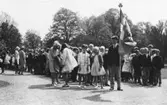 Skolavslutning. Lärare dirigerar klassen. Adolf Fredriks skola. Sjungande barn på skolavslutning i Mariaskola med musiklärare Erik Göransson som körledare.
