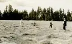 Lieslåtter på fäboden Åsmundshyttan Nr 9, "Erik Anders". Från vänster är det Per Hansson sonen Joel Hansson och Arnold Jönsson. De tar ett varsit slag som syns på bilden bortanför dem, där hösträngarna ligger där de tidigare gått fram. Det var ett ansträngande arbete att slå åkrarna med lie. Bilden finns med i Torsåkers Fotohistoriska Sällskap. Bild 5:3.