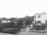 "Roos handelsträdgård vid Kyrkogårdsvägen." Funkisvilla med trädgård, några människor syns framför huset. Växthusen ligger till vänster i bild. Villan omgärdas av låga murar med planteringar. (Se även bild MR2_2454, 2455 och 2638)
