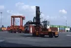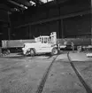 En gaffeltruck lyfter upp en förarhytt för en X 2000 tåg som ska lastas på en lastbil.