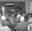 Inackorderingshem 27 april 1968 Två män och en kvinna sitter vid ett bord och pratar och dricker kaffe. På bordet ser man också vitsippor. Bakom dem står en tv med blommor på.