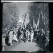 Besökare och uppställda flygplan på flygbanan på Bromma flygplats vid invigningen den 23 maj 1936. Civilregistrerade flygplan, bland annat tyska. I förgrunden flaggstänger med svenska flaggan. Text vid foto: "Invigningen av Bromma"
