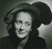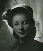 Porträtt av kvinna, möjligen modellen Hjördis Grundel-Starenius, i hatt med fjäder.