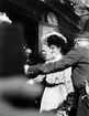 EN KVINNA SITTER PÅ EN PALL OCH HANDMJÖLKAR EN KO. EN MAN HÅLLER KON, SOM TILLHÖR BO GÅRD I LUGNÅS.