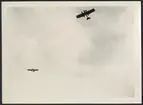 Test av kulsprutemontering på militärt flygplan Lohner D tillhörande Österrike-Ungern. Två män i flygplanet, Edmund Sparmann är flygförare. Vy från sidan.
