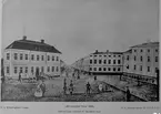 "Till vänster Elfbringska huset. Hörnhuset i mittten P. Muréns hus. Till höger G. Luths hus. Järntorget före 1869". Foto av teckning av A. Bång.