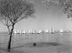 Segelbåt på Lac Léman (Genfersee, Lac de Genève) med berget Dents du Midi i bakgrunden.