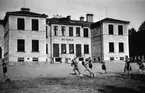 Text till bilden:"Skolanoch gårdsplanen är omgiven av barr och lövträd V.U.".