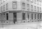 En man och en kvinna framför en butiksbyggnad. Text på skyltfönstret: "Zelma Hallenberg cigarr & tobakshandel".