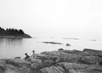 En badbild från Rullsand. Brämen var själva byn och bestod av två gårdar. Arrendatorn hette Lundberg och familjen Brundins sommarställe var en f d skogvaktarbostad. Den närmaste badplatsen hette Brämsand och lite längre bort låg Rullsand, som var mycket långgrunt. Udden längst bort heter Klyxen.