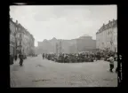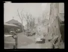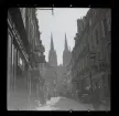 542/B Dimma. Människor passerar på trädkatad gata.