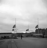 Vägstation N2, Skedala. Vy från väg mot förråds- och garagebyggnader. Flaggstång.