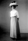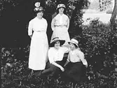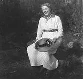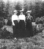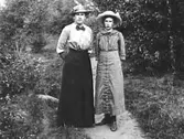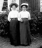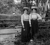 TVÅ KVINNOR I EN SKOGSGLÄNTA KLÄDDA I VIDBRÄTTADE HATTAR.
