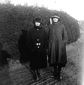 TVÅ VÄLKLÄDDA KVINNOR UTE I NATUREN.