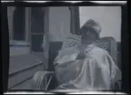 En kvinna sitter i trädgården utanför familjen Morthensens villa Solveden, Djursholm.