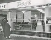 POSTEXPEDITIONEN GÖTEBORG 46. Doktor Bex Gata 4 G, Guldheden, Göteborg, den 29 juli 1954. Exteriör av postexpeditionen. Tömning av brevlådan utanför entrén.