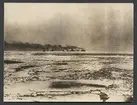 Bilden visar ett slagfält från första världskriget. Området är helt uppgrävt av artillerield och täckt med vatten, slam och spillror av krigsmateriel. I bakgrunden syns ett kolon hästvagnar som passerar på en väg.