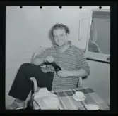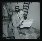 583 Sickan Carlsson för 25an Allers. Sickan Carlsson i en dörröppning, pekar på en skylt "Autografer påskrivas icke. Hänviselse Filmstaden".