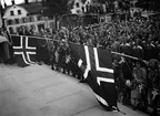 Firande av Norges nationaldag 17 maj, paraden från Vaksatorg till Universitetshuset befinner sig utanför Gustavianium på Akademigatan
