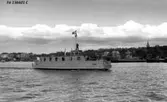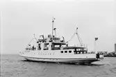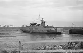Foto i svartvitt visande bil & passagerarmotorfärjan Prinsessan Margaretha i Köpenhamn under april månad år 1955.