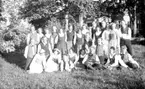 Karlsborgs folkdanslag på besök i Forsvik år 1912. I mitten Ekring som bildade sällskapet 1910. Förstoring 25 x 41 cm. Neg finns.
