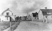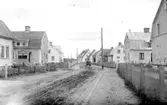 Folkungatan österut mot Tegelviksplan. Till vänster på höjden Fåfängan med Tegelvikens Verkstad A B i kvarteret Verkstade nedanför. Ur skorstenen vid Liljeholmens Stearinfabrik i kvarteret Sommaren bolmar rök.