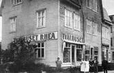 "Tvålhuset Rhea, Skomakeri, Skoaffär." Vykort postat den 20/7 1925. Vi ser Frölundagatan 18 (Mölndalsbro 46) senare kallad "Lutande huset" eftersom byggnaden lutade ut över gatan.