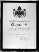"Hans Maj:t Konungen af Sverige Gustav V, har behagat att till Dess Hovleverantör antaga Juveleraren Anton Emil Hildebrand, Gefle, hvilket jag på nådig befallninga får till bevis meddela. Stockholm Slott den 26 maj 1928 .......".