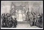"En brud på norr". En brud med tärnor i sal med gäster. Två män lyser upp bruden med två stora ljusstakar. Litografi av Fritz von Dardel, 1830-/-40-tal.