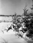 Frimärke ur Gösta Bodmans filatelistiska motivsamling, påbörjad 1950. Frimärke från Finland, 1959. Motiv av stiliserad gran och tall. "Forstförvaltningen 100 år: 1859-1959".