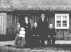 Kvinnor och man framför Lovisa Jansdotters torp på gränsen mellan Litslena by och Hällby gård, Litslena socken, Uppland, 1910-tal