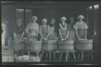 Elever vid Uppsala Hushållsskola. Flickorna är klädda i mörka klänningar och ljusa förkläden, tre stycken har en vit hätta på huvudet. Flickorna håller i olika hushållsredskap. Bakom skymtar en dörr och ett draperi.