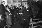 Postverkets tryckeris 50-års jubileum. 1959. Jubileumssupé på Hotell Malmen i Stockholm, den 9/11 1959. Postbankens gåva till Postverkets tryckeri. Postsparbankschefen Sven Lönnqvist t.v. uppvaktade med tre tavlor, komponerade av postsparbankens reklamtecknare Paija Smidt. Tryckeriingenjör Harald Broström och överingenjör Gustaf Ljungberg t.h. beundrar.