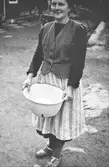 "Mamma myser", 1920-tal i Kållered. En kvinna håller en skål full med ägg.