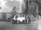 Spigården (N V) före 1911. Huset före det som är omskrivet vid bild nr A145230_469. Uppfördes på 1840-talet, revs 1911. Fr.v: 1. Astrid 2. Nils 3. Johan Napoleon Johansson /(sbf 1900 f 1877) 4. h.h. Maria Johansson 5. Miriam (på stolen) 6. Stina / (sbf 1900 Stina Lisa Nilsdtr f 1843) 7. Gustav Johansson, bror till nr 3. /( sbf 1900: Gustaf Adolph f 1878) 8. Johannes Johansson / sbf 1900 Johannes Karlsson f 1843, far till 3 o 7, make till 6)