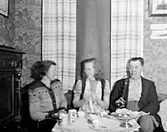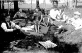 Högshult. Stugan, som låg högre upp på backen än den nuvarande, är här fotograferad från öster. På baksidan fanns två källare. Låset från en av dem, daterat 1776, finns på en logdörr. Revs 1909. Fr.v: 1. Maja-Stina, farmor. 2. Maria Charlotta 3. Frans August Gustavsson, make till nr 2. 4. Robert 5. Ernst Reprofotograf: Gunnar Berggren.