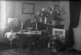 Televerkets personal. Kvinnorna är festklädda. De har samlats runt en sittgrupp. På bordet står kaffekoppar, kannor och glas. Möblerna är omaka. På väggen hänger en stor spegel. Från vänster: Mary Pettersson (stående), Birgitta Andersson Thörnqvist (tittar mot de övriga), Maj-Britt Lööw (tittar på fotografen), Lilly Hedlund (längst till vänster i soffan), Sonja Bergström Johansson, Eva Gethe (telekommissarie), Inga-Britt Andersson Johansson och Barbro Hermansson Jonsson (längst till höger i soffan), Stående: Asta Larsson, Forsberg, Inger Larsson Nyberg och Ingrid Forsberg. Toni Liljeborg (randig klänning. Toni började arbeta som telefonist 1918.) och Maj-Britt Johansson. Läs om Televerket och branden 1956 i Arboga Minnes årsbok 1993.