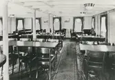 Redarvåningens salong sedd från styrbord mot babord. Väggar i blågrått siden. Möbler polerade, gråsvarta, klädda med blågult siden. Armatur och bokskåp med mattslipat ofärgat glas.