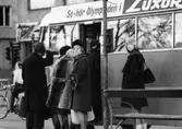 "Tag plats." En samling bussresenärer kliver på bussen vid Göteborgsvägen i Mölndalsbro någon gång på 1960-talet.