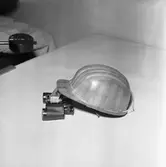 En dam klädd i dräkt och en man klädd i kostym sitter ned och samtalar. I händerna har de varsin kikare. Bilden är tagen i samband med "Operation kullen" 1955.