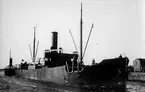Foto i svartvitt visande last-turbinångfartyget "LIFLAND" av Köpenhamn, vid kaj i Köpenhamn under andra världskriget.