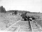 Järnvägsbygge Uppsalabanan. Bärgning av urspårat lokomotiv, Salnecke, Örsundsbro, Uppland, vy från väster, sannolikt 11 april 1911.