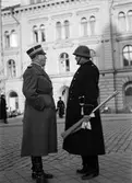 Hantverkargatan 1, Stadshuset. Luftskyddsövning i Stadshusets luftskyddscentral. De två sittande männen fr. h. övervaktmästaren F. Sandahl och stadshusets luftskyddschef Gunnar Norgren.