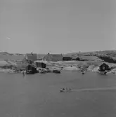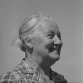 Telefonreportage, Ishockey klar 31 januari 1966 En kvinna står vid en hög disk på vilken det står en vit telefon. Hon håller dess vita lur mot örat. Hon är klädd i en vit tröja. I bakgrunden skymtar ytterligare en kvinna samt ett fönster med gardiner framför.